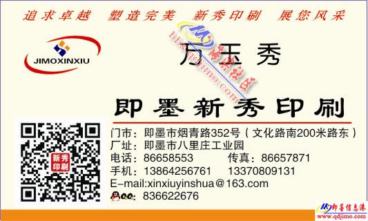 青島新秀包裝印刷廠位于青島即墨,業(yè)務(wù)接單門市一部新秀電腦名片印刷位于即墨市煙青路352號環(huán)秀苑斜對面,二部即墨富萬家印刷部,位于即墨市岙蘭路寶龍廣場東800米,三部華域廣告,位于煙青路熱電廠南,印刷廠擁有送貨車三輛,全套印刷加工設(shè)備,標(biāo)簽機,印刷機,數(shù)顯切紙機,裝訂機,折頁機。為廣大客戶提供高質(zhì)量、高效益、方便快捷的全面印刷、包裝解決方案。保證了印刷包裝生產(chǎn)速度、供貨時間及產(chǎn)品質(zhì)量
