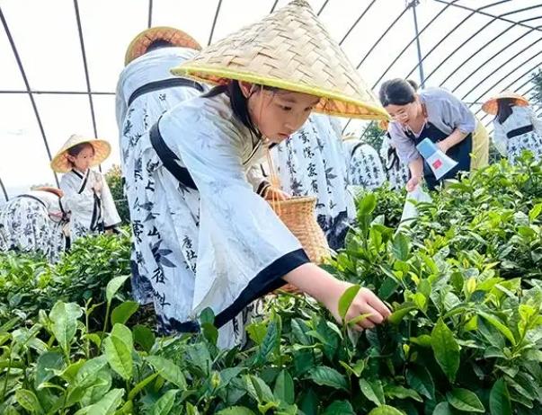 當(dāng)講解環(huán)節(jié)結(jié)束,孩子們挎起精巧的竹編茶簍,即刻化身“小小茶農(nóng)”。他們穿梭在錯落的茶壟間,漢服的水墨紋樣與翠綠茶芽相映成趣,竹笠的編織紋路在陽光下泛著質(zhì)樸光澤。彎腰、提指、采摘,一系列動作雖稍顯生疏,卻滿是認真。有的孩子還互相交流采摘心得,“你看這芽頭多飽滿”“原來采茶要這么輕才不會傷了茶樹”,田園間的歡聲笑語與茶葉的清香交織成獨特的研學(xué)樂章。