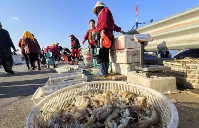 “快來看看啊!剛上岸的梭子蟹,35元一斤,保準新鮮。”漁家大嫂王秀麗從船上接過一筐梭子蟹,麻利地放在攤位上,大聲吆喝起來。她的攤位前很快圍滿了人,有的市民已經(jīng)迫不及待地蹲下身,用手輕輕捏著蟹子的腹部,挑選著肥美的梭子蟹。