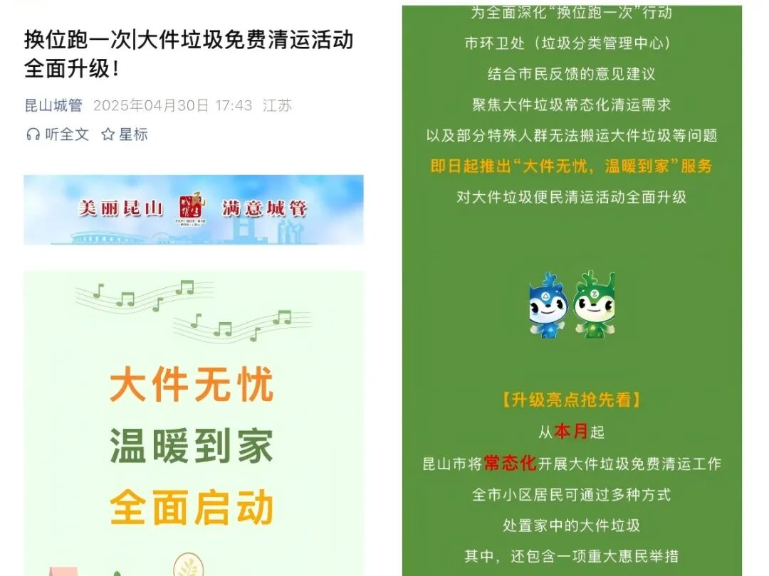 今年4月,我市推出大件垃圾免費上門清運服務,居民只需通過社區(qū)熱線或“鹿路通”APP垃圾清運模塊預約,即可享受便捷的上門回收服務。昆山高新區(qū)綜合行政執(zhí)法局市容環(huán)衛(wèi)科副科長魏勤介紹,該服務特別關(guān)注老年人、殘障人士等群體的需求,通過社區(qū)網(wǎng)格化管理實現(xiàn)精準對接,讓清運服務更貼心、更高效。市住建局相關(guān)工作人員表示,將進一步優(yōu)化服務流程,加快響應速度、擴大覆蓋范圍,扎實做好這件民生“關(guān)鍵小事”,提升市民的滿意度與獲得感。