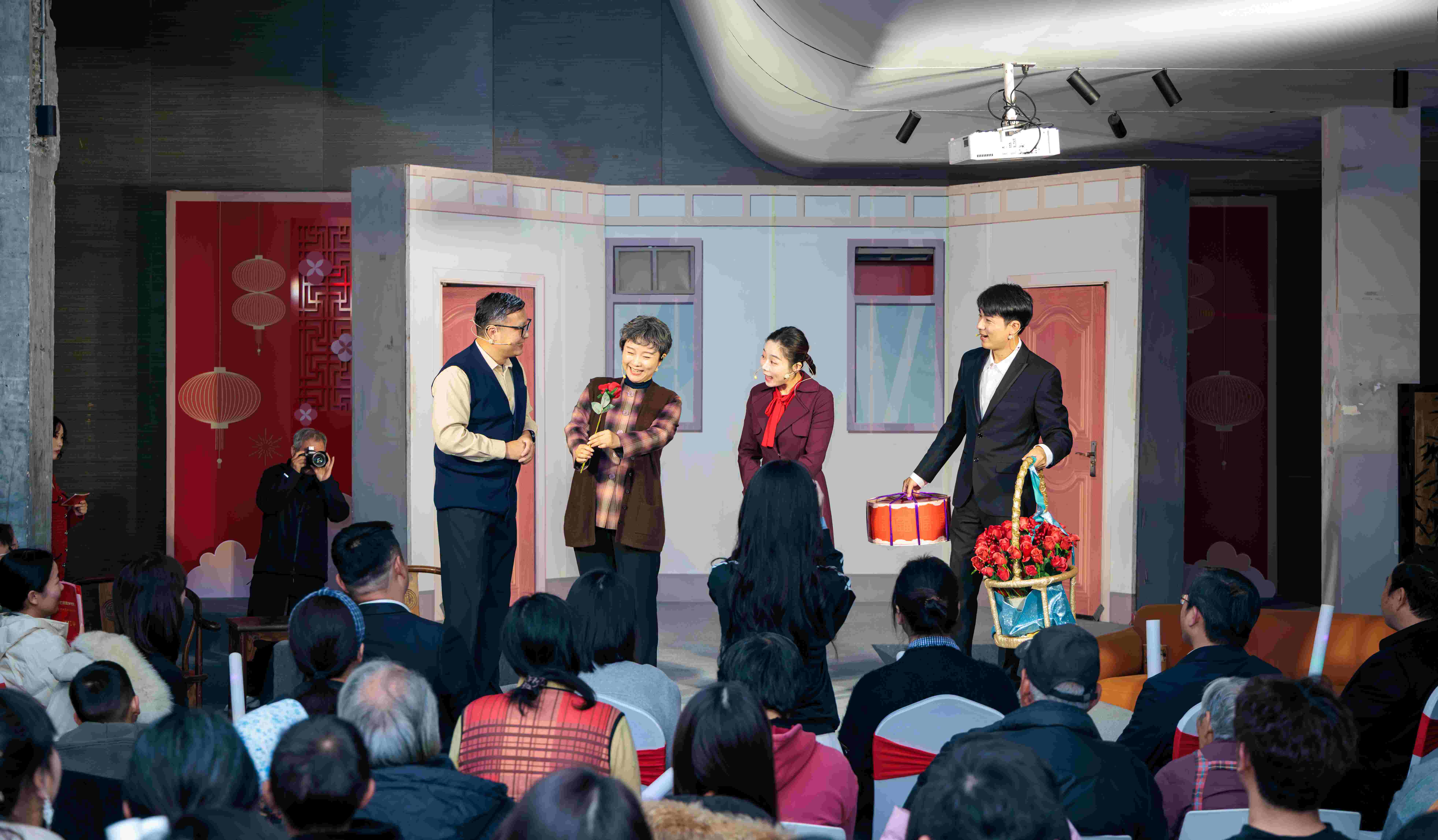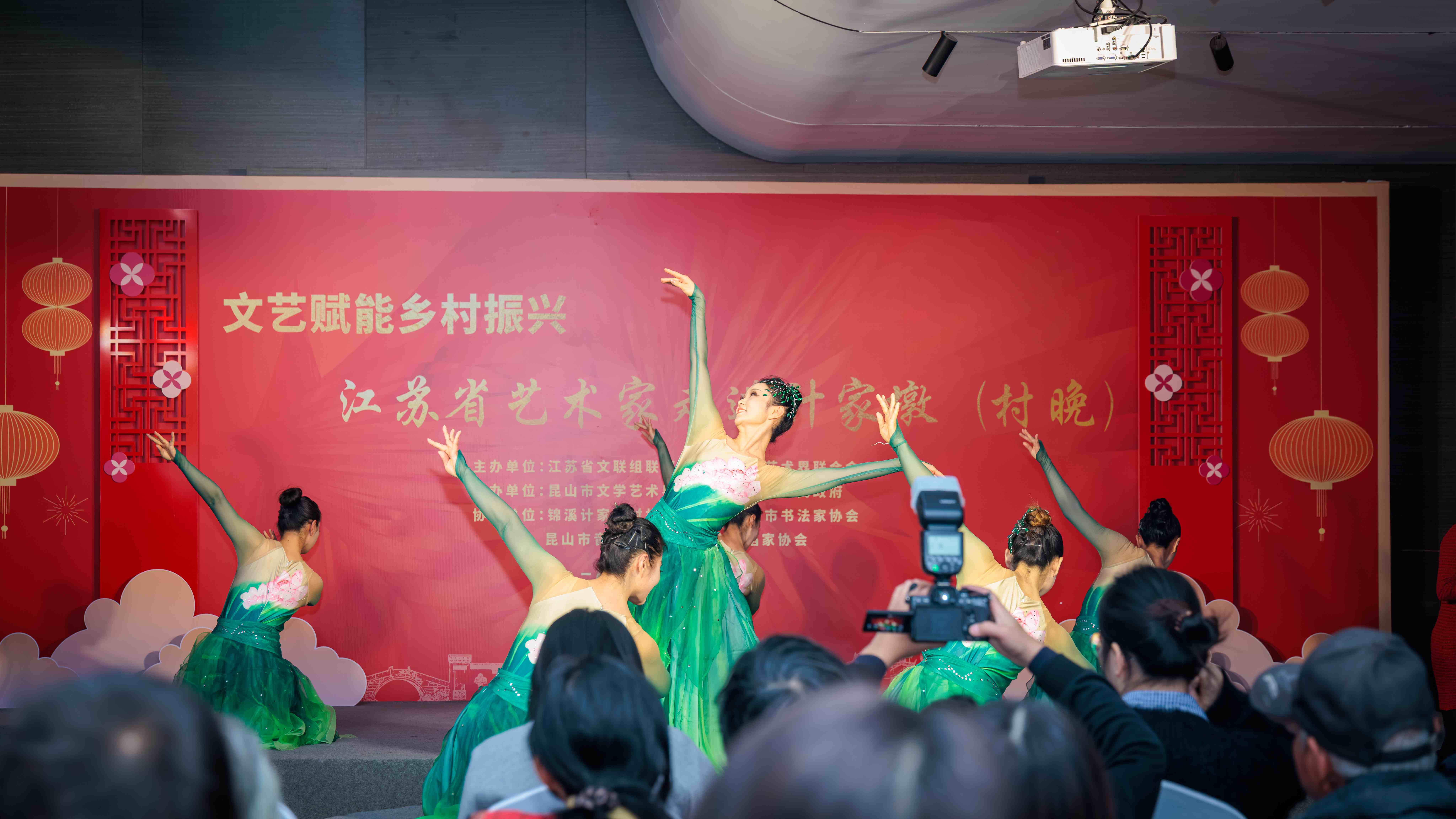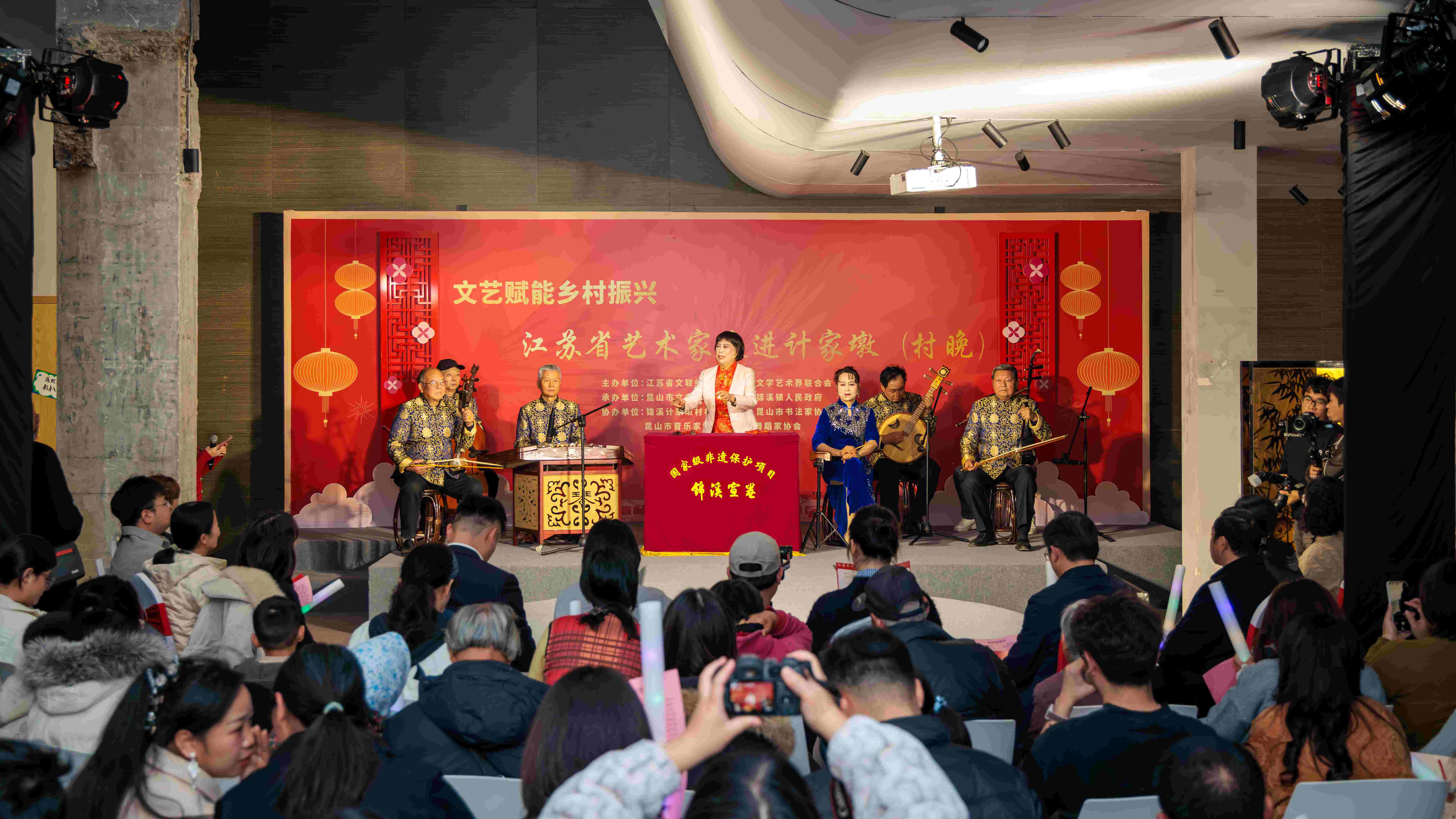 暮色降臨,計(jì)家墩村禮堂燈火通明、暖意融融。來(lái)自江蘇省演藝集團(tuán)、蘇州市以及昆山市文藝團(tuán)體的藝術(shù)家與村民歡聚一堂,共享“村晚”。
