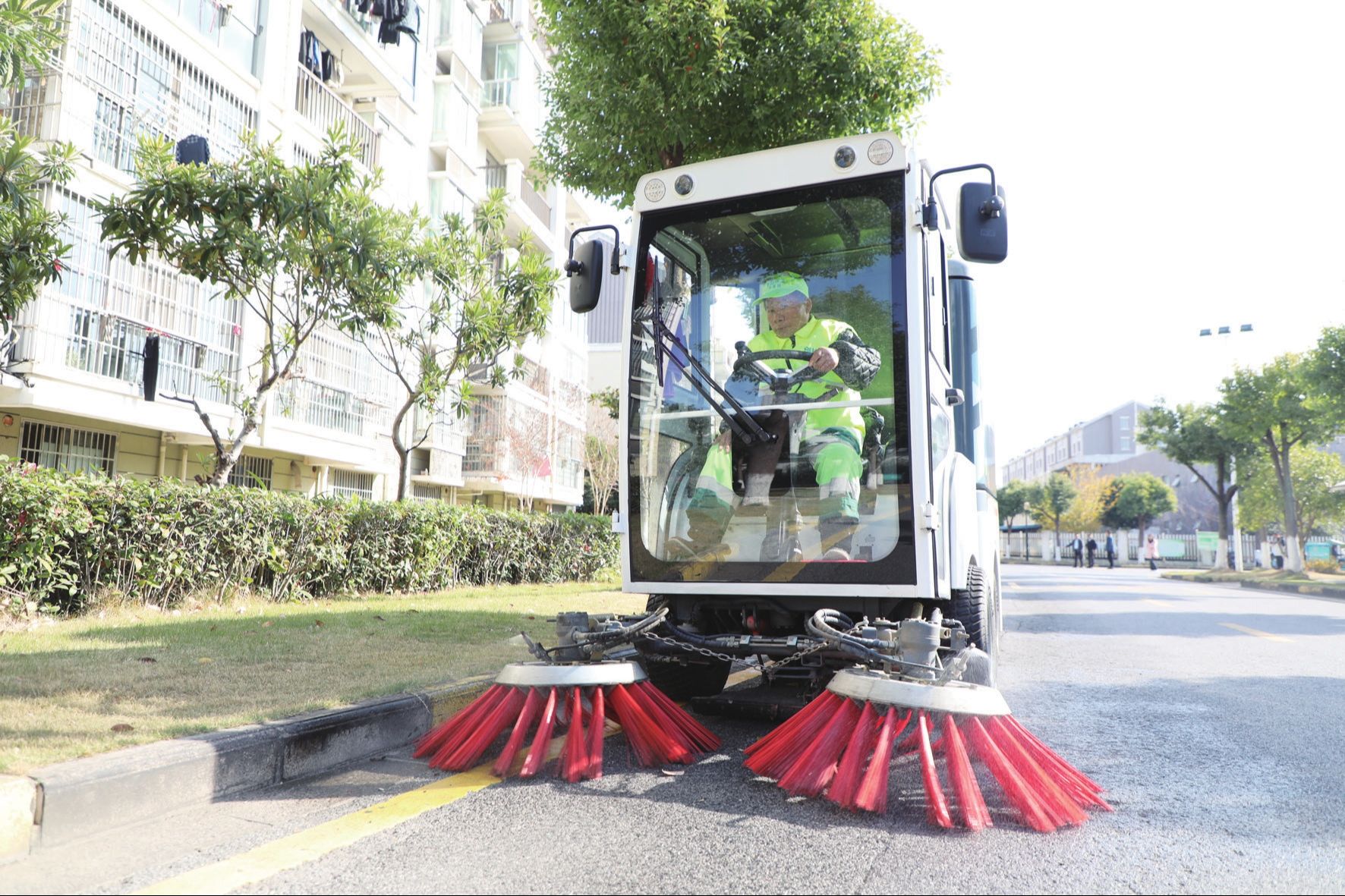 上午10點,祝家厙新村內(nèi),大型洗掃一體車和多功能掃地車緩緩駛?cè)?,伴隨著機(jī)械作業(yè)的聲音,原本藏在角落的灰塵、落葉被逐一清掃干凈?!耙郧扒鍧嵻囍辉隈R路上作業(yè),小區(qū)里全靠人工掃,一些衛(wèi)生死角總是掃不干凈?,F(xiàn)在清潔車開進(jìn)小區(qū),路面亮堂多了,住著也更舒心了?!奔易∽<覅囆麓宓膮前⒁绦χf。