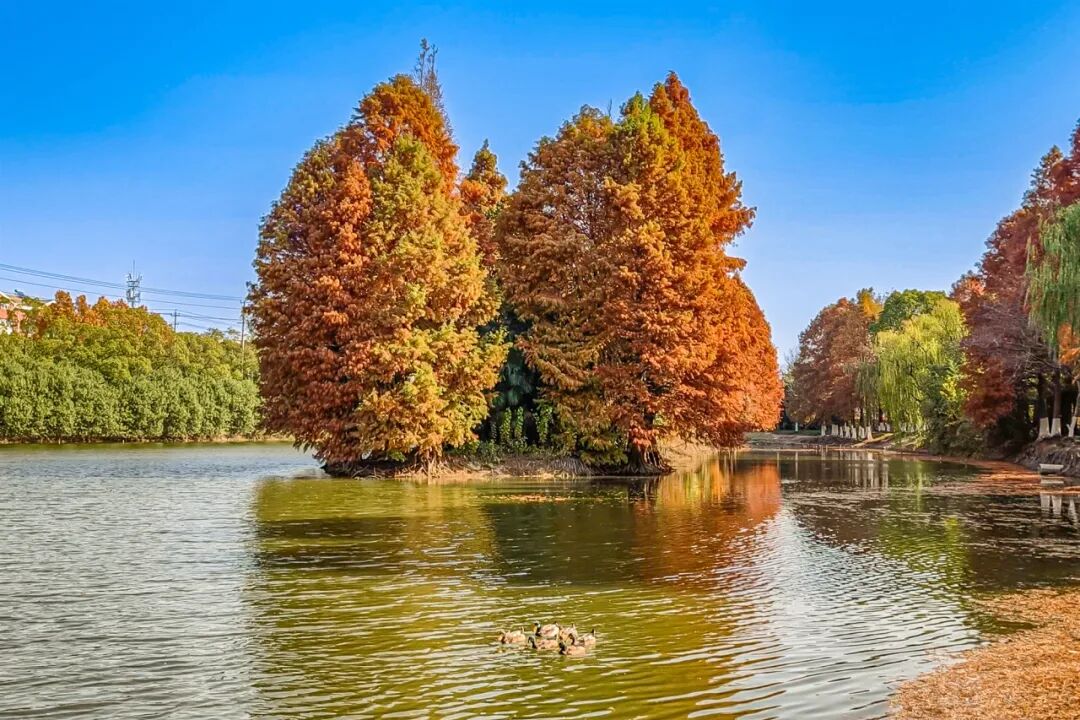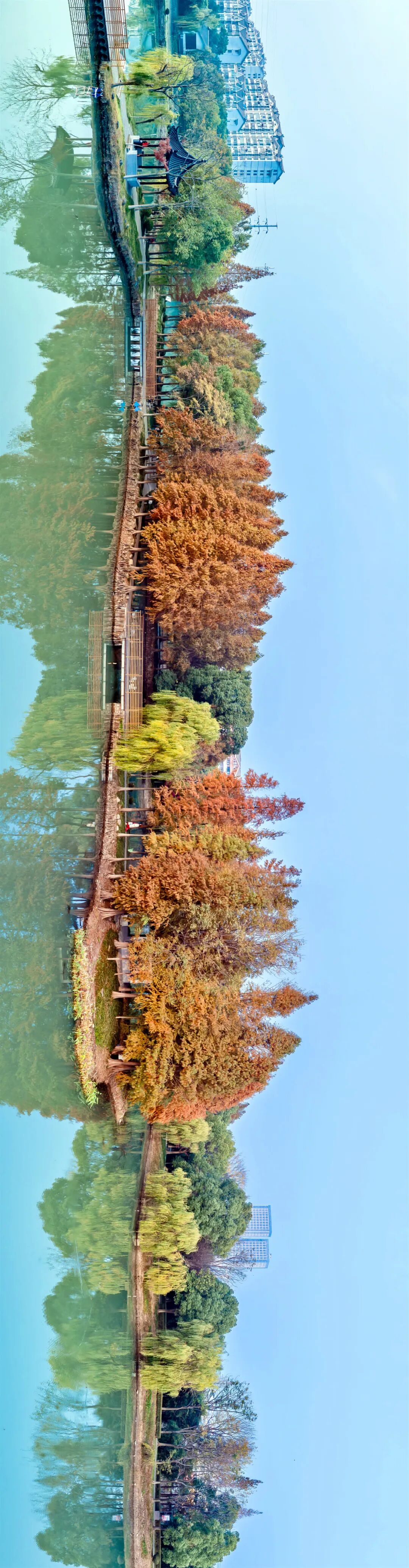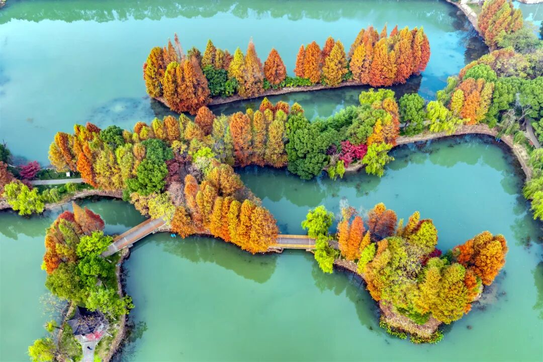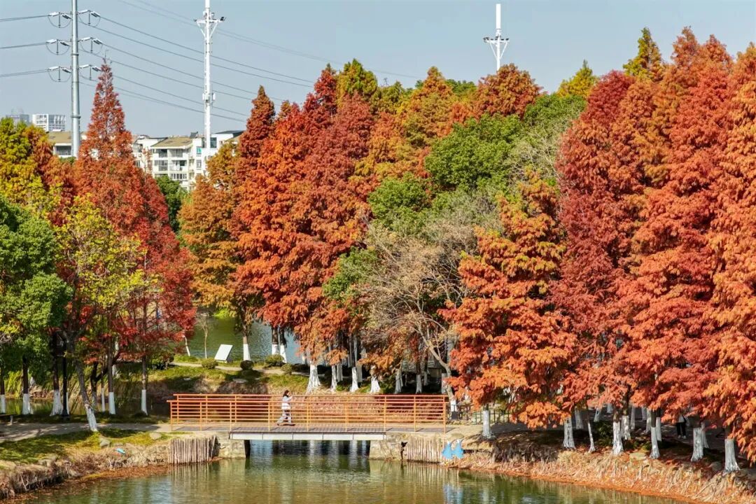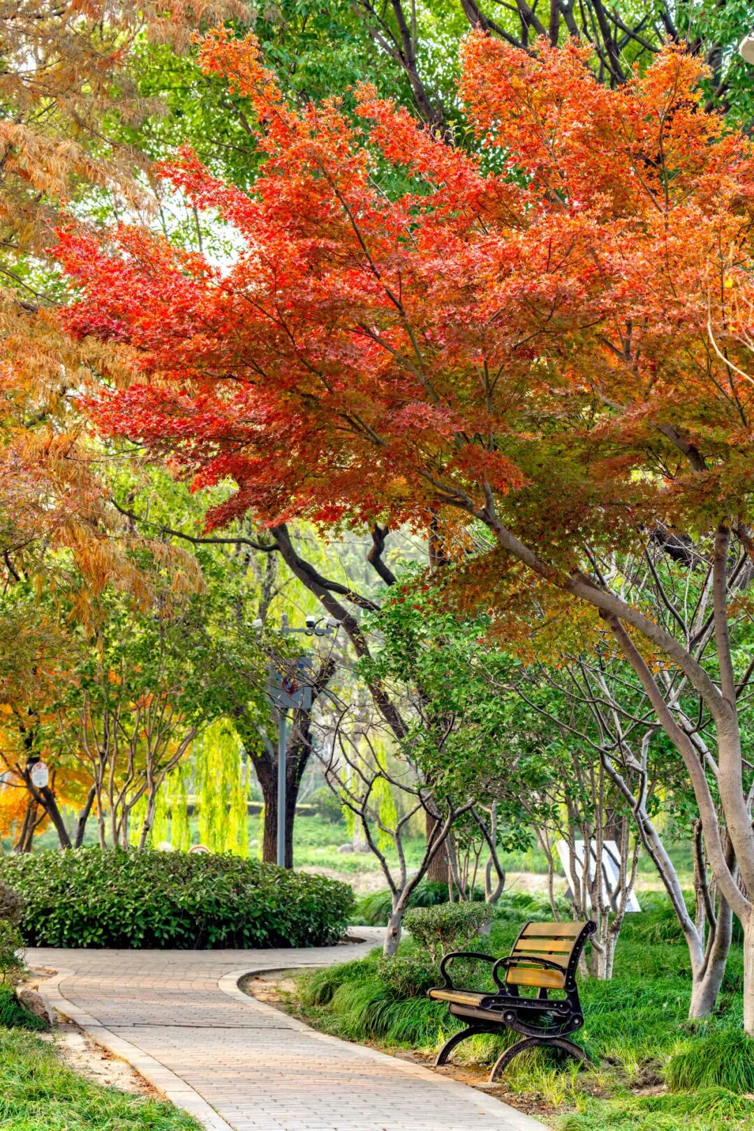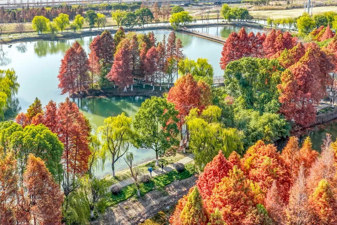 景楓公園建設(shè)于21世紀(jì)初,總面積約為5.24萬平米,其中水域面積占比約55%。公園以濱水空間為重點(diǎn)建設(shè)內(nèi)容,通過鄰水步道、串聯(lián)各島,做到慢行貫通。植被以水杉、紅楓等大量色葉樹與麥冬等林下常綠地被的搭配,打造一處碧波倒影、色彩分明的四季景色公園。