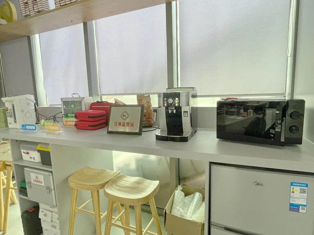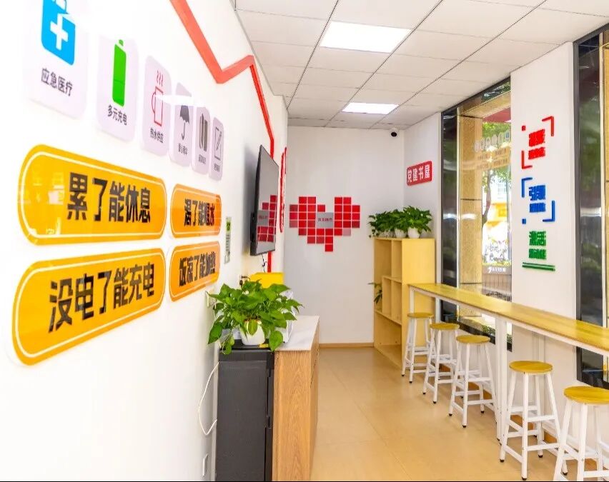 設置休息區(qū)、充電區(qū)、閱讀區(qū)、交流展示區(qū)、能量補給區(qū)、關愛服務區(qū)等9個功能區(qū)域,配備空調、冰箱、休息桌椅、微波爐、應急藥箱、便民箱、簡易維修工具等,隨時能“一站式”解決需求。