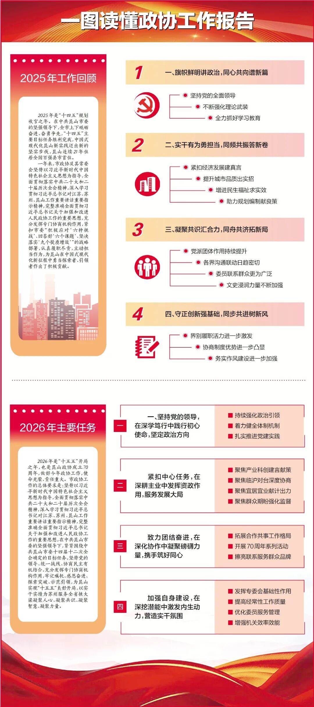 2026年是“十五五”開局之年,也是昆山政協(xié)成立70周年。市政協(xié)工作的總體要求是:堅持以習近平新時代中國特色社會主義思想為指導,全面貫徹落實中共二十大和二十屆歷次全會精神,深入學習貫徹習近平總書記對江蘇、蘇州、昆山工作重要講話重要指示精神,完整準確全面貫徹習近平總書記關于加強和改進人民政協(xié)工作的重要思想,在中共昆山市委的堅強領導下,緊緊圍繞中共昆山市委十四屆十二次全會確定的目標任務,堅持黨的領導、統(tǒng)一戰(zhàn)線、協(xié)商民主有機結合,充分發(fā)揮專門協(xié)商機構作用,牢記囑托、感恩奮進、探索突破、示范引領,為昆山實現“十五五”良好開局,以實干實績?yōu)樘K州服務全省挑大梁凝聚人心、凝聚共識、凝聚智慧、凝聚力量。全市政協(xié)組織和政協(xié)委員要堅持黨的領導,在深學篤行中踐行初心使命,堅定政治方向;緊扣中心任務,在深耕主業(yè)中發(fā)揮資政作用,服務發(fā)展大局;致力團結奮進,在深化協(xié)作中凝聚磅礴力量,攜手筑好同心;加強自身建設,在深挖潛能中激發(fā)內生動力,營造實干氛圍。