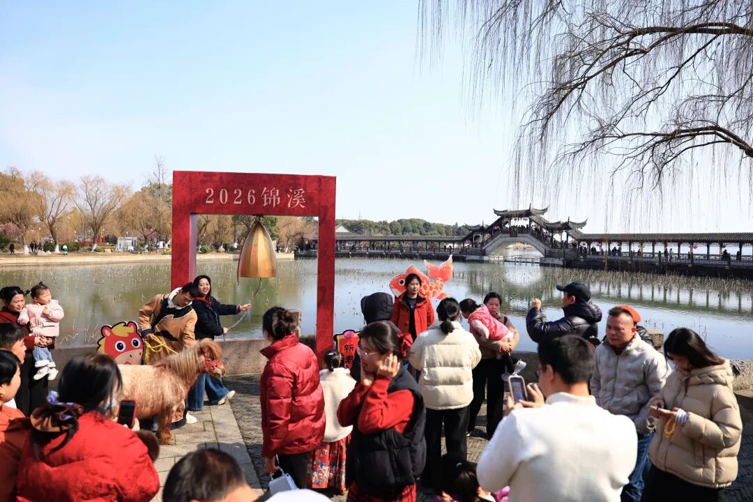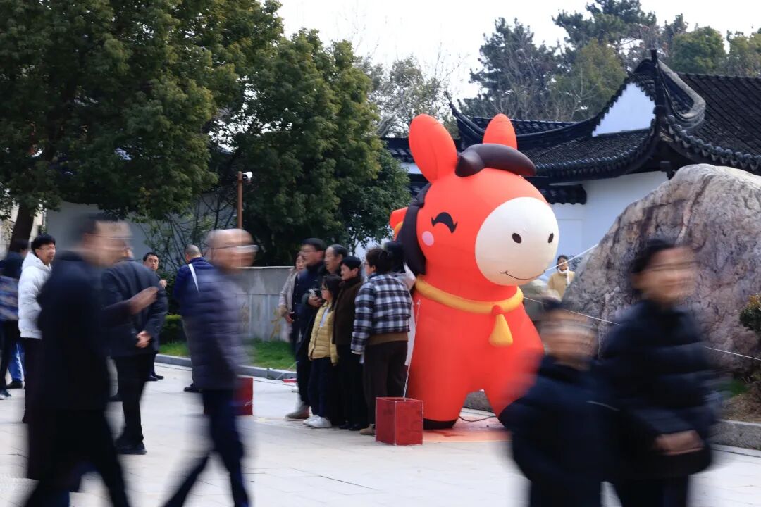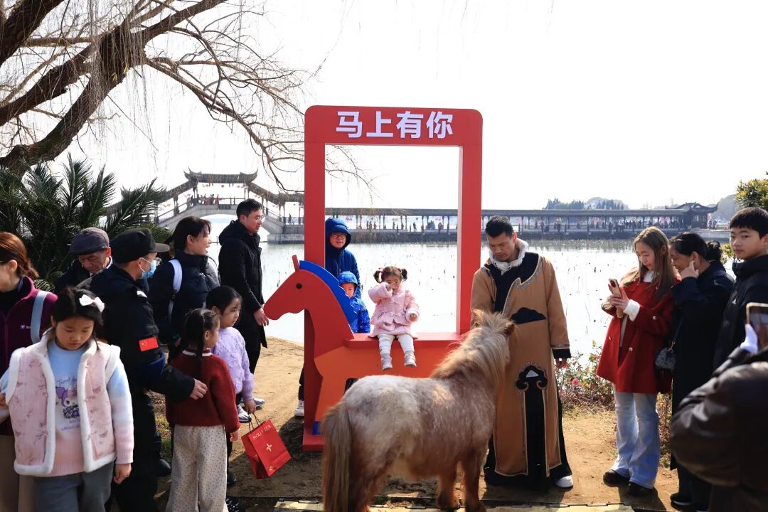 漫步錦溪,從青石板老街古鎮(zhèn)行至鄉(xiāng)野田園間的計(jì)家墩村,“馬”元素早已悄悄鋪滿各個(gè)角落,處處透著丙午新春的欣欣向榮。古蓮池畔,開運(yùn)鈴隨風(fēng)輕響,一旁的彩色小馬懷抱福字元寶,憨態(tài)可掬;古蓮橋旁,“馬上有你”打卡點(diǎn)甜度拉滿,吸引眾多游客駐足合影;文昌廣場(chǎng),紅色充氣小馬馱著福袋亮相,“馬上有?!泵葢B(tài)十足;計(jì)家墩村人民雅集廣場(chǎng),“拍馬屁”造型別出心裁,不少游客俯身抬手、佯裝輕拍馬臀,笑意盈盈間為新歲討個(gè)好彩頭。