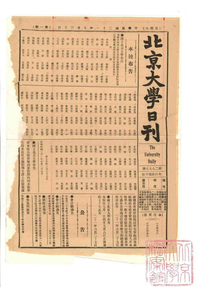 1932年7月30日刊有劉亞生等錄取新生姓名的《北大日刊》第2877號(hào)。北京大學(xué)檔案館供圖